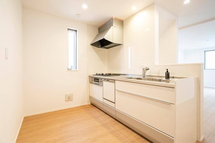 LDKの白い壁にマッチしたクリスタホワイトのキッチンは、クリナップ。食洗器付で、調理器具などを収納するスペースもたっぷり。対面式なので、家族やゲストと会話を楽しみながら料理ができます。