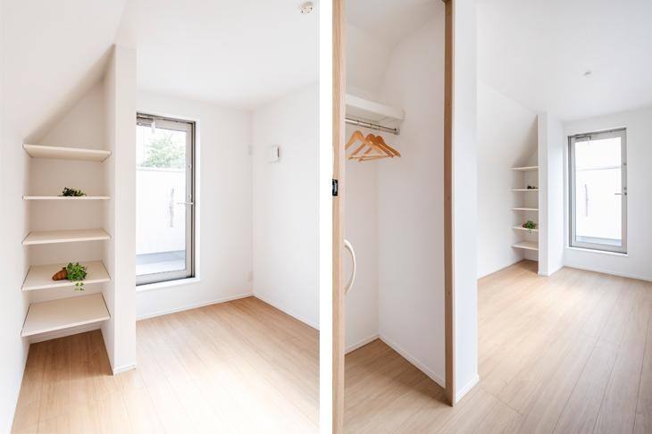 3階にある主寝室は5.03畳。掃き出し窓は、陽当たりのよいバルコニーにつながっています。クローゼットは、奥行きも十分で、服の収納以外にも使い方が広がりそう。勾配天井下のスペースを活かした棚は、飾り棚としてはもちろん、生活スタイルに合わせた収納棚として活用できます。