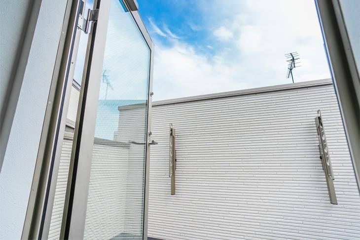 3階のバルコニーは、コンパクトながら機能的なつくり。東南に面しているので陽当たりがよく、布団を干せばフカフカに。洗濯物を干すスペースも十分確保されています。また、正面の壁を少し高くしたことで、隣家とのプライバシーも保たれます。バルコニーに出ると、視界を遮る大きな建物がないので、都心の空の高さが実感できます。