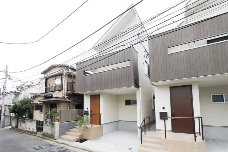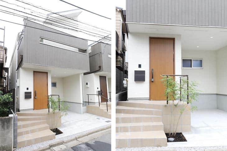 外観で目を惹くのが、2階のバルコニー。白壁に映えるウッディーなダークブラウンのフェンスには、横長の開口部を設けました。光と風を運ぶとともに、デザインのアクセントとなり、都会に建つ家にふさわしい洗練された雰囲気を醸し出しています。アプローチを彩る植栽スペースも高ポイントです。