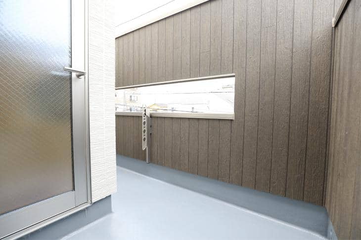 リビングのドアの向こうに広がるバルコニーは、ウッディーなフェンスに囲まれたリラックスできる空間。プライバシーを守りながら、採光性・通風性に配慮した設計になっています。洗濯ものを干すのはもちろん、イスとテーブルを置いたり、夏には小さなビニールプールで遊んだりと、使い方が広がります。