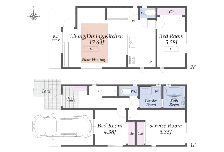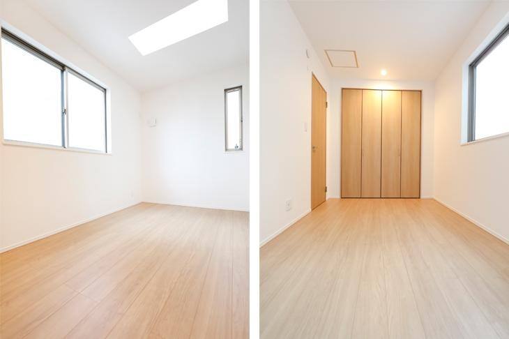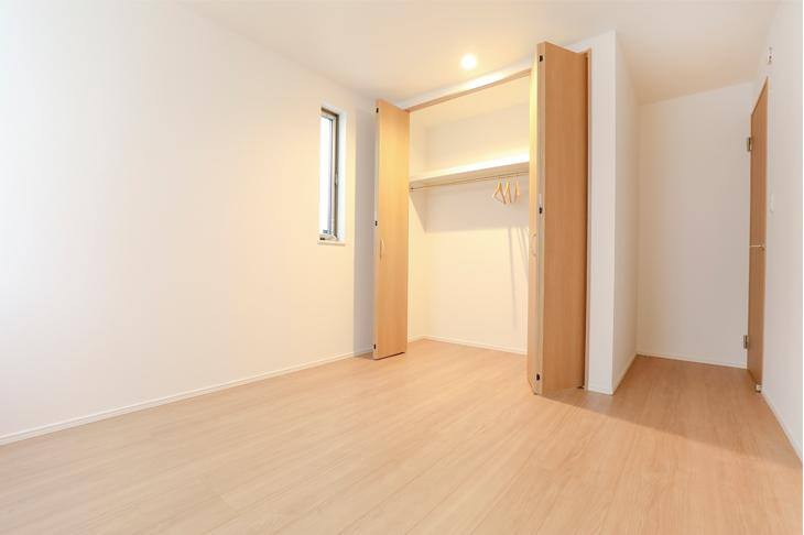 1階のサービスルームは、6.35畳。オーク色で統一されたフローリングやドアが、スッキリとした空間を演出しています。ワイドなクローゼットは、高さもあり収納力もたっぷり。衣類はもちろん、季節家電やアウトドア用品なども収納しておけます。