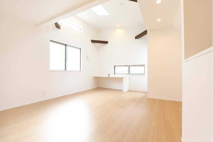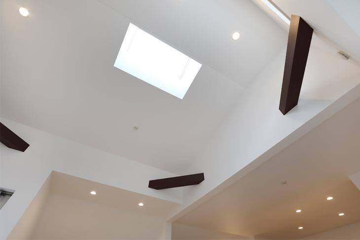 2階に広がるLDKは、最長3.5mの勾配天井を生かした、開放的な空間です。白を基調にした空間のアクセントとなっているのが、天窓を囲むように四方に配されたダークブラウンの梁。LD空間に設置した、さまざまな形の窓が作り出す表情とともに、モダンな雰囲気を演出しています。