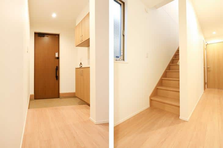 木の質感が美しい重厚感のある玄関ドアを開けると、ゆったりとした玄関ホールへ。タタキには、ベビーカーやゴルフバッグなどを置く十分なスペースを確保しました。玄関ホールからは、2階につながる階段への動線もスムーズ。来客時もスマートに2階のリビングへ案内できます。