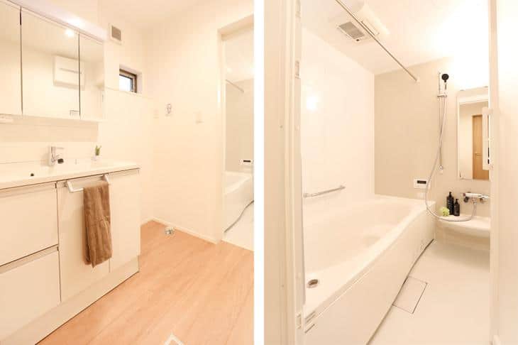 ホワイトを基調にした清々しい洗面台とバスルームは、ともにパナソニック。洗面台横のランドリースペースとバスルームにも、小窓を付けました。三面鏡のミラー裏の収納は、便利なコンセントの差し込み口付き。シンプルながら使い勝手の良い空間が、毎日のスタート&リセットを気持ちよくサポートします。