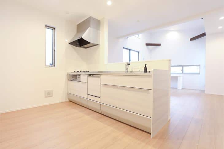 白いパネルが美しいモダンな対面式キッチンは、クリナップ。ゆったりとしたシンクとたっぷりの引き出し式収納を備え、毎日の調理をサポートします。シンクやコンロの前面には光沢のあるキッチンパネルを備えているので、水はねや油はねも拭き取りやすく、片付けもスムーズ。