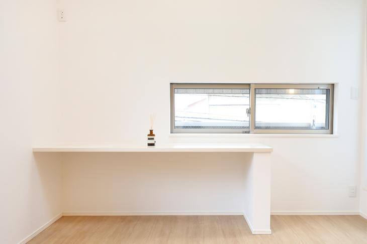 リビング・ダイニングには、窓のそばにワイドなカウンターを備え付けて、明るくて、スッキリとしたワーキングスペースをしつらえました。パソコンコーナーとして、また子どもの勉強や家事の作業台として、多用途に活用できます。
