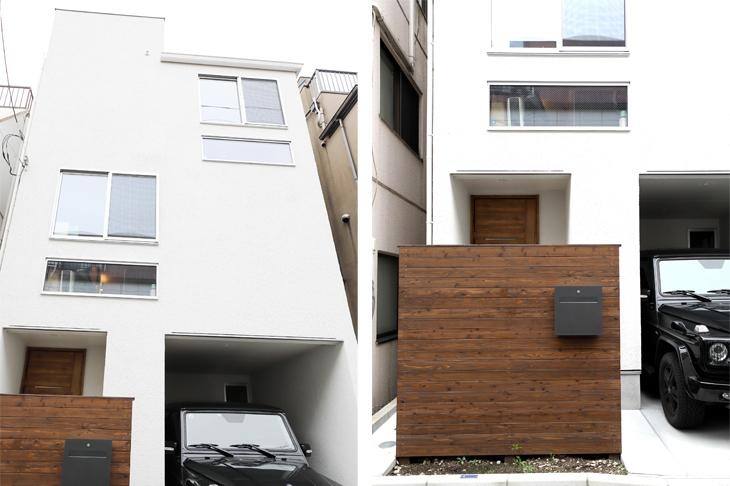 (右)木目でコーディネートしたオシャレな玄関。ゆくゆくは木製フェンスのまわりに植物を植えて、癒しの空間にする計画だそう。