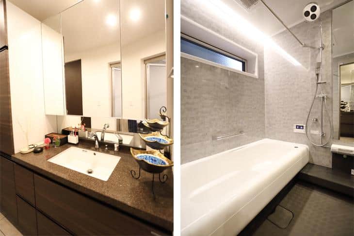 (右)バスルームはグレー系で、シンプル&モダンにまとめました。ゆったりとした流線型のデザインがオシャレな浴槽はトクラス。