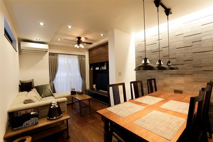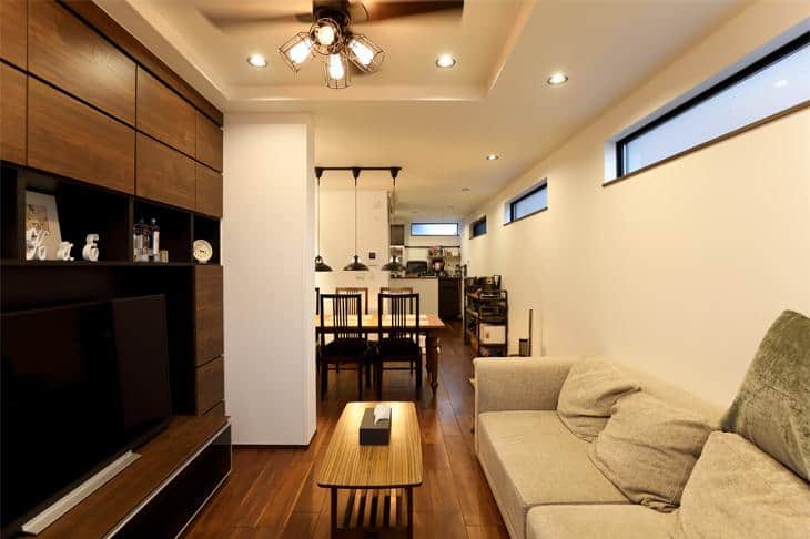 隅々まで気を配って作りあげた家の中で、特に気に入っている場所は、ご夫婦ともに「居心地の良いリビング!」とのこと。折り上げ天井に取り付けた照明のシーリングファンを回すと、床暖房で暖かくなった室温がさらにアップして快適になるそうです。「家の雰囲気に合うかどうかで、家具や家電を選ぶのがコーディネートのコツ」とご主人。家が完成した後も、I様ご夫婦の楽しいインテリアづくりは、まだまだ続きそうです。
