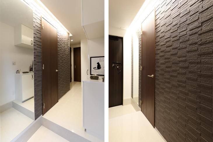 (右)壁の一面に取り入れたダークグレーのエコカラット。折り上げ天井部の間接照明が暖かく出迎えます。