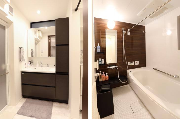 (右)バスルームのアクセントカラーに洗面所と同じダークグラウンを取り入れたことで、モダンな空間になりました。