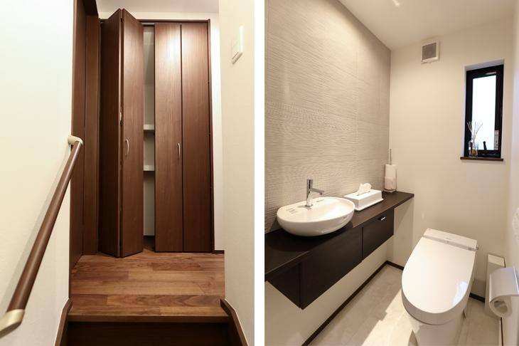 (右)3階のトイレは、大きな手洗いシンクやエコカラットを採用して、ラグジュアリーな雰囲気に。