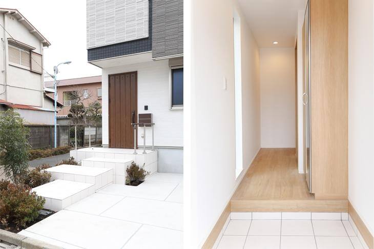 ゆるやかな階段のアプローチと玄関ホールには、同じ白いタイルを採用。ドアを開けると広々とした一続きの空間になります。玄関がコンパクトなので背の高いシューズクローゼットを廊下に設えました。鏡面扉付きで収納力も十分です。