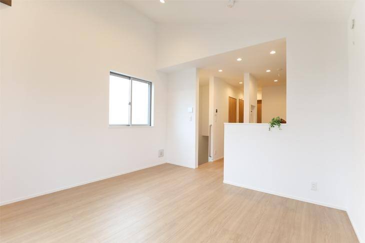 2階のLDKは、廊下をなくしたワンフロア。勾配天井が開放感を生み、思わず伸びをしたくなるような大空間です。白壁に映えるブラウンの梁がリビング全体のアクセントになっています。