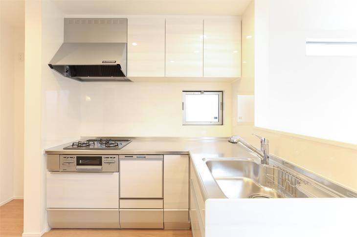 キッチンはLDKの内装に合わせて、クリナップのペアウッドホワイトをセレクト。光沢があるので高級感あふれるキッチンに仕上がっています。コーナーにつけた小窓やコンロ横の冷蔵庫スペースなど、小技の効いた設計もポイントです。