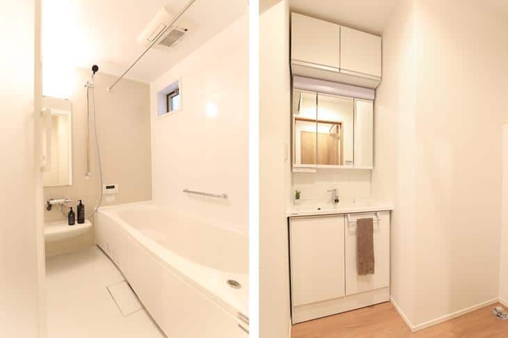 1階の水まわりは、ホワイトで統一された爽やかで飽きのこない空間。洗面台とバスルームはパナソニックを採用し、色と質感を合わせました。洗濯機を置くスペースも洗面台横に確保しています。