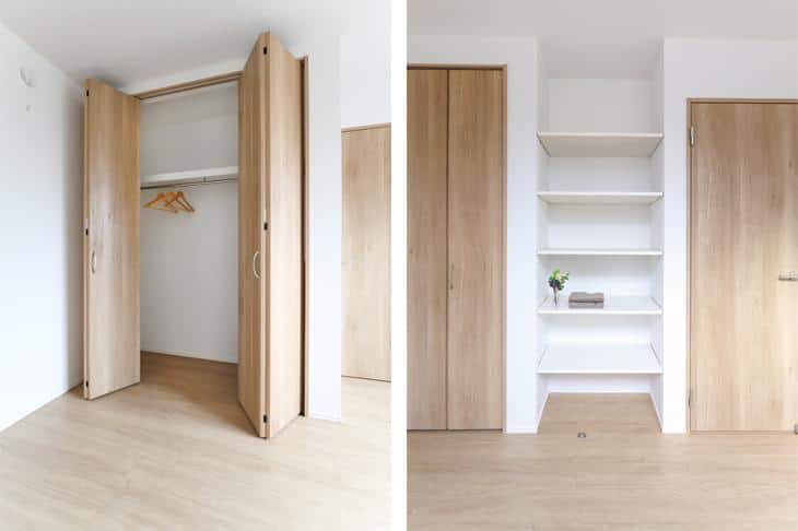 サービスルームと主寝室に、クローゼットを設けました。さらに主寝室には、大きな造り付けの棚を。衣類などの収納や小物のディスプレイスペースなど、アイデア次第で使い方が広がります。
