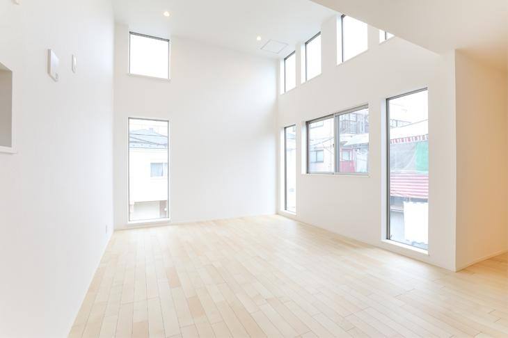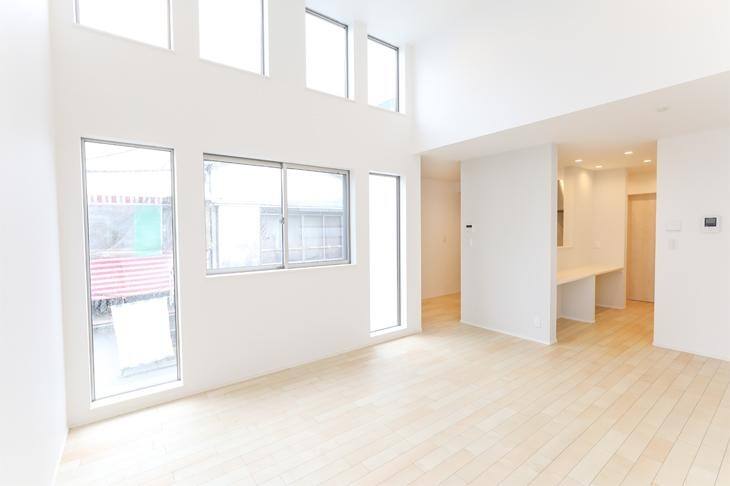 2階に広がるLDK空間は、18.91畳のゆったり空間。リビング部分の最大天井高は3.8mあり、壁一面に並ぶ窓と相まって開放感を演出しています。フローリングには上質な白木タイプを採用して、統一感のあるコーディネートに。白い空間に映える四角い窓の表情が、この家のチャームポイントになっています。