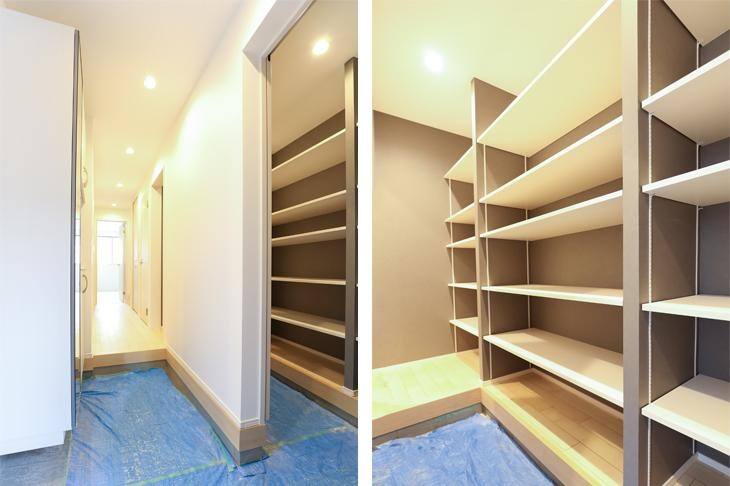 玄関ホールの右手には、大空間のシューズインクローゼット。グレーの壁紙がスタイリッシュな広々としたスペースです。靴はもちろん、アウトドアやスポーツ用品、日用品のストック、使わない季節家電など、たっぷりと収納できます。廊下からも引き戸を開けてアクセスできる2ウェイ仕様も高ポイント。さらに玄関の左手にも、シューズクローゼットを2つ設けました。
