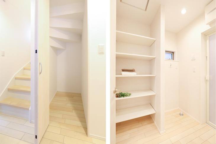 中野区の家2では、デッドスペースを活かして豊富な収納スペースを設計。階段下は、奥行きの広い収納スペースに。スーツケースなどの大物や掃除機などの収納にも便利です。また、2階の洗面所には、造り付けの収納棚を設けました。家族分のタオルや肌着、洗剤などの置き場にも困りません。