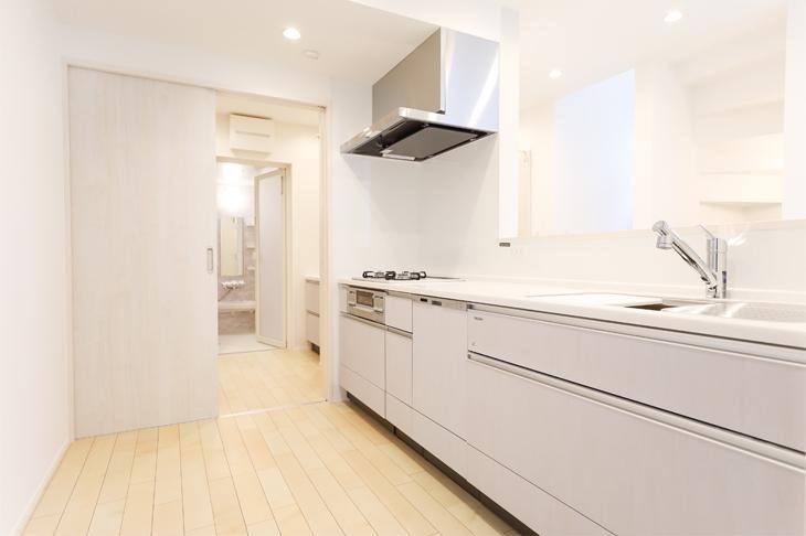 白い木目調のパネルでトータルコーディネートされたキッチンは、タカラスタンダード。対面式キッチンのシステムキッチンや換気扇も、ワンランク上のセレクトです。セミオープンの対面式キッチンなので、家族とのコミュニケーションもスムーズ。キッチン奥の引き戸の先は、洗面所&バスルームにつながっています。