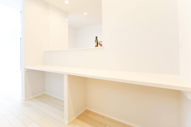キッチンの対面には、造り付けのカウンターを備えました。飾り棚やカフェテーブルに、アイロンがけやパソコンなどの家事スペースとして、子どものワークデスクなど、家族のスタイルに合わせて便利に使えます。