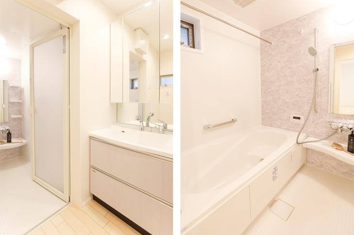 白を基調にした爽やかな洗面台は、タカラスタンダード。三面鏡裏の収納棚に加え、背面に造り付けた収納棚を使って、細々とした日用品からファブリック類まで、しっかりと収納できます。バスルームは、LIXIL。ストーン調のアクセントパネルが白い空間に映え、高級感を演出しています。