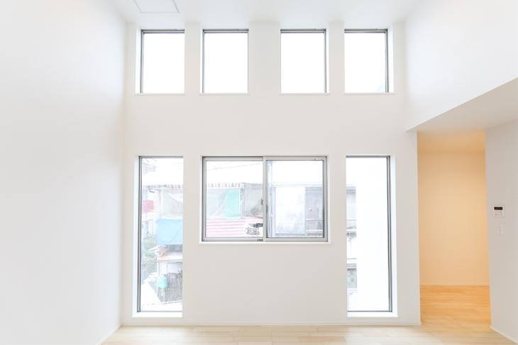 リビングの天井高を活かした、大胆な窓の配置。明るい光に包まれる心地の良い空間演出にひと役買っています。また、スクエアの窓が規則正しく並ぶ眺めも、空間のアクセントに。ウインドートリートメント次第で雰囲気を変えて楽しめます。