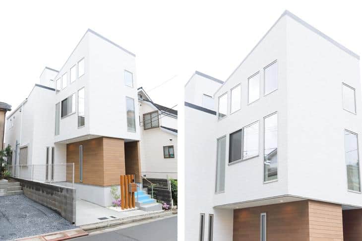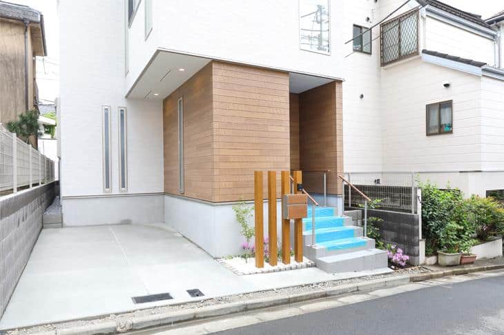 キューブを組み合わせたような、ユニークなデザインのモダンな外観。中でも目を惹くのが、2階のリビングに並ぶ窓の表情です。玄関ポーチに採用した、ウッディーな壁が白壁のアクセントに。高級感の中に遊び心を取り入れて、都会らしい上質なデザインハウスに仕上げています。