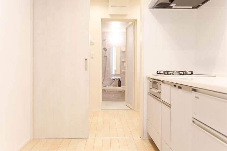 キッチン横の引き戸の向こうは、洗濯機置き場のある洗面所。その奥はバスルームと水まわりを集中させることで、家事動線がスムーズに。家事の時短がくつろぎの時間を届けます。洗面所は廊下からもアクセスできる便利な2ウェイ仕様です。