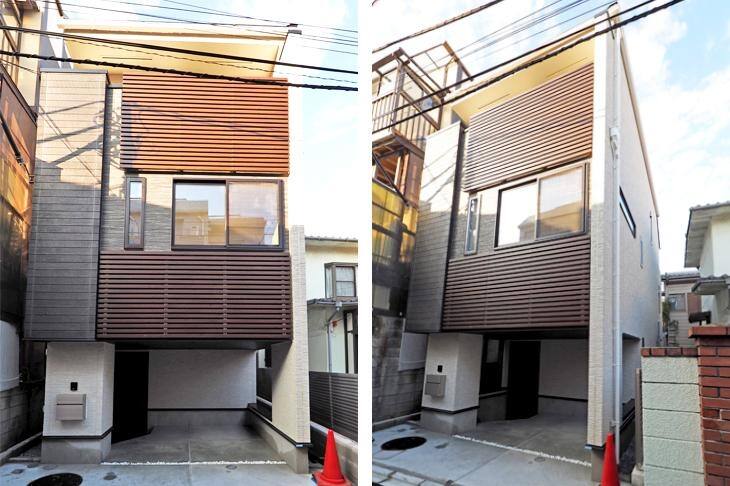 アイボリーの外壁にダークブラウンのアクセントを加えた、上品で温かみのあるデザイン。ウッド調のサイディングやルーバーが、都会らしい洗練された雰囲気の中にも、落ち着いた印象を演出しています。