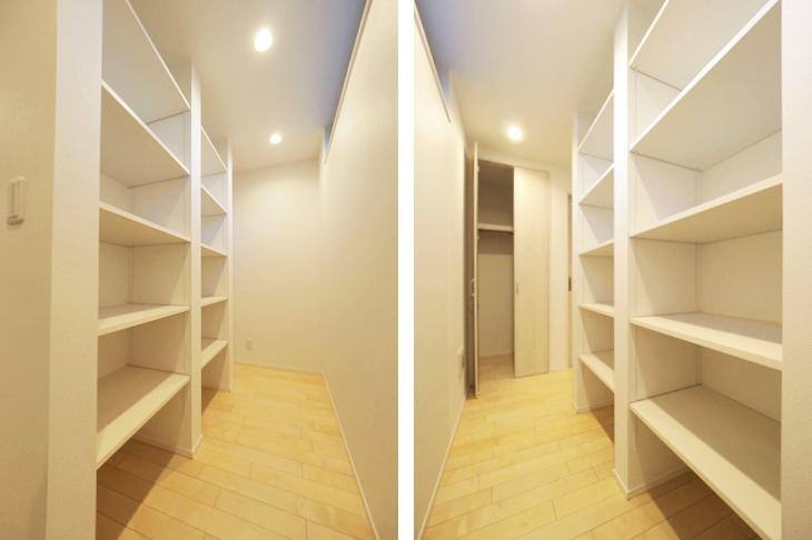 キッチンの奥には大容量のパントリーを設置。食料品のストックや掃除用品、お子様のおもちゃなどLDKで使うものをたくさん収納することができます。扉付きの収納部分はお客様の上着を掛ける際にも重宝します。