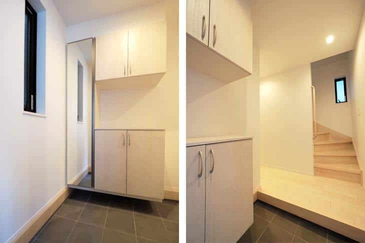 グレーのタイルが空間に引き締まりをもたせたエントランス。シューズボックスが3つあるので、家族全員の靴も余裕をもって収納することができます。ボックス内の棚は高さが調節可能。長靴やブーツも折れずに収まります。