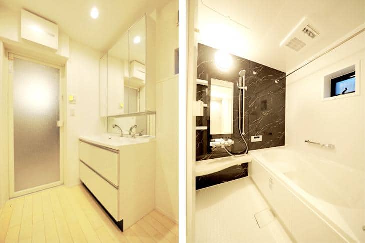 日々の疲れを癒す浴室は、ゆったりと過ごせる1坪サイズ。浴室乾燥付きで湿気にも雨の日の洗濯にもしっかりと対応できます。洗面台には三面鏡裏の収納と、大きな引き出し収納が2つ。洗剤、タオルのストックや家電などを、用途に分けて収納することができます。