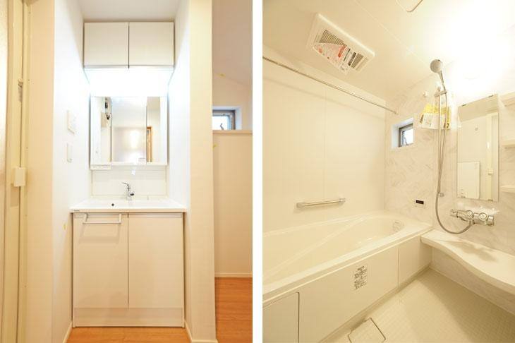 洗面台はパナソニック製。上下についた奥行きのある収納には、備品をしっかりと保管できます。バスルームは、足を伸ばしてのんびりとバスタイムを過ごせる1坪サイズ。3つのラック付きで、シャンプーやボディーソープの置き場にも困りません。