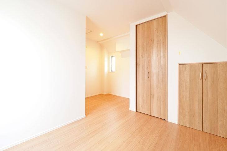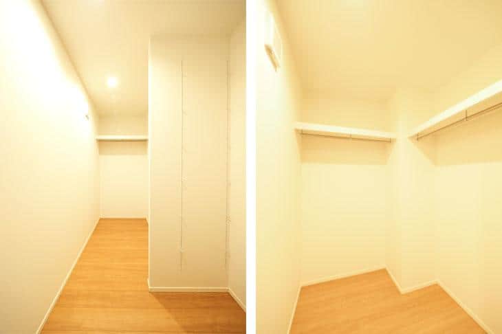 3階の寝室は大小2つのクローゼット付き。大きなクローゼットには、ロングコートやワンピースを、小さなクローゼットは奥行きがあるので、ボリュームのあるダウンコートやキャリーケースなど、かさばってしまうものも収納できます。