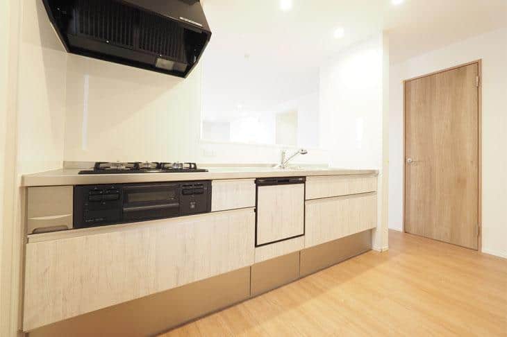 キッチンは清潔感と温かみのあるホワイトの木目調。豊富な収納スペースを活用して、使いやすい場所に調理器具を置くことができます。