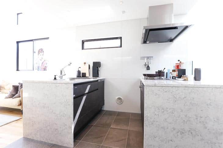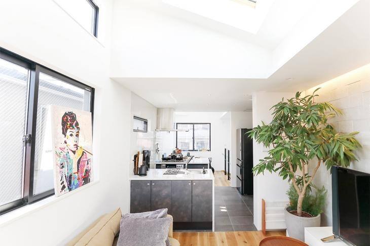 3階は、手前からダイニング、キッチン、リビングという斬新な間取り。真ん中に配置した2列型キッチンは、シンクをリビング側、コンロはダイニング側とふり分けました。「この配置だと、洗い物をしながらテレビが見られるし、ダイニングにいる人と話しながらお肉が焼けるんです」と笑顔のM様。休日に仲間と楽しげに料理をする様子が浮かんできました。