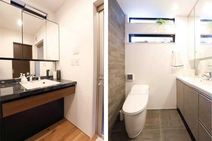 (右)2階の広々としたトイレには、手洗いも付けました。ゲストが1階のバスルームを使っていても、もう1つあると安心です。