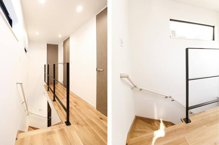 設計の2つ目の工夫は、「ストレート階段」。「普通はまわり階段だと思いますが、細長い敷地を生かして、あえてストレート階段に」というM様。ありきたりではない家にしたかったというM様ならではのこだわりです。手すりをアイアンにしたことで抜け感が生まれ、居室とLDKで階を分けるなど、スペースを区切りながらも、空間のつながりを感じさせる家になりました。