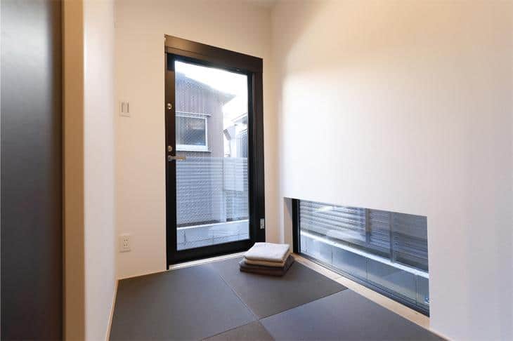 3階建の建物は、各階のテーマや用途にあわせて、独立した部屋やコーナーで区切られています。1階には、ゲスト用の居室と水まわりを集約。バスルーム横の細長いスペースも、広めのパウダールームとして使うのではなく、畳コーナーに。オシャレなタタミを敷き詰めた家事室になりました。