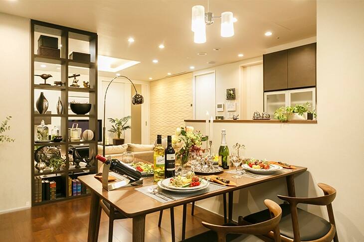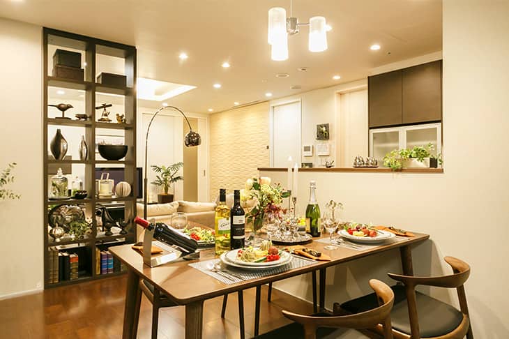 - そうですね。これは「折り上げ天井」といって、この部分だけ10cm高くなっています。また、ダイニング側にある間仕切りの家具は固定されているんですが、オプションで付けることができます。