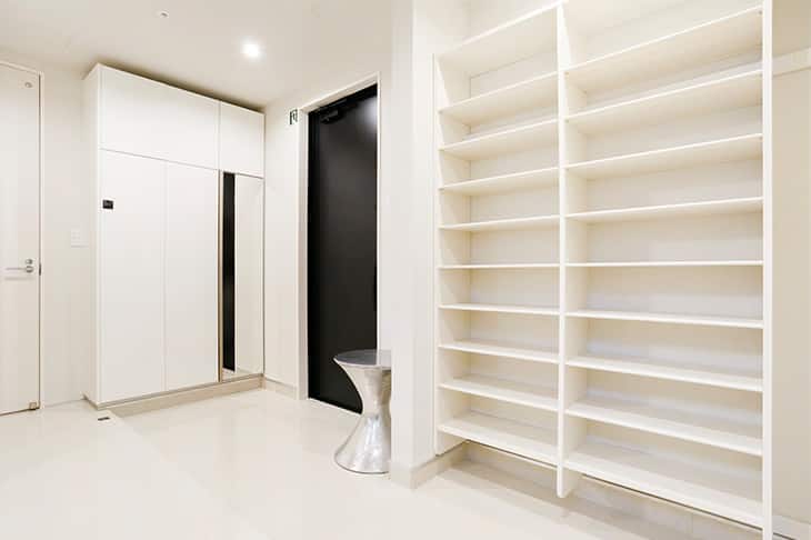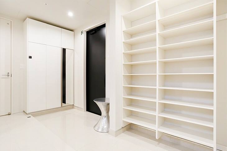 - 玄関を入ったらそのままシューズインクローゼットになっています。実際にはここまで広く取らなくても十分ですが、こういうスペースがあればベビーカーやゴミ箱を置いたりできます。また、大理石調の床に合わせて、ツヤのある鏡面タイプの玄関収納にして、テイストを揃えました。