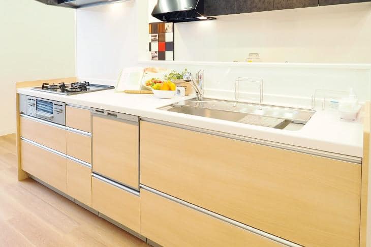 - 標準のキッチンよりも奥行きをしっかり取って、90cmあります。アイランドキッチンにする場合は、対面で軽食をとれるカウンターのように使うこともできます。