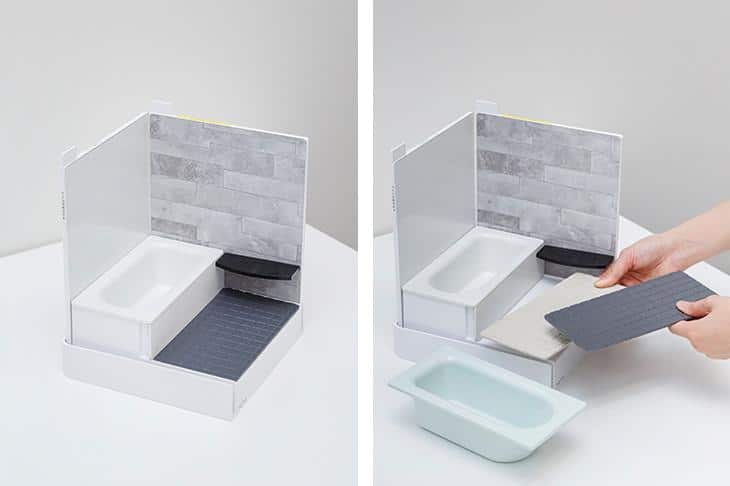 - 変えられますよ。バリエーションがたくさんあるので、ミニチュアの模型を使って、壁の色と浴槽の組み合わせをシミュレーションしていただけます。