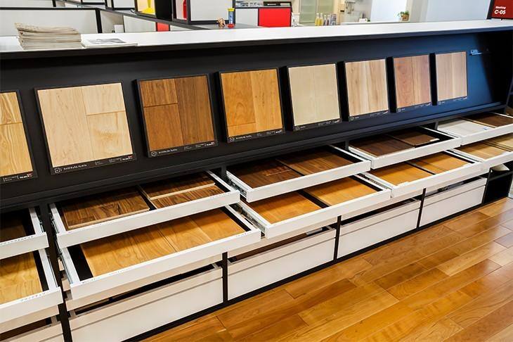 - 続いてインテリアのブースをご案内しますね。こちらは床材を選べるコーナーです。