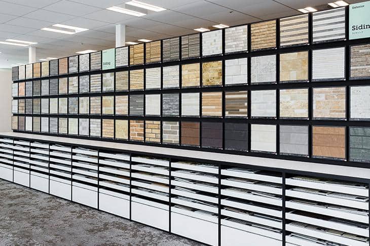 - 今日は外装や内装についてお話ししていきますね。まず、こちらは外壁のコーナーです。ここにあるものは、すべて標準で選べる「サイディング材」と呼ばれるものです。