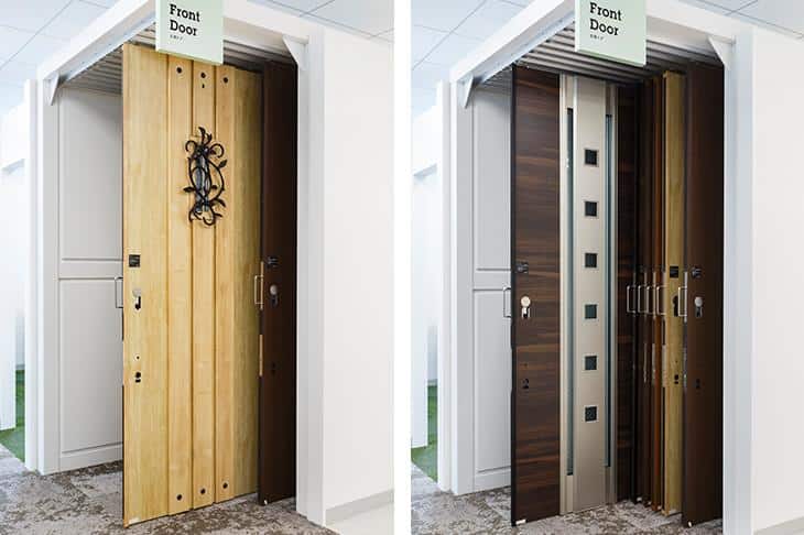 - ここにある玄関ドアはすべてオプションのデザインですが、種類が多いので、外観のテイストに合わせて選んでいただきます。色もいろいろあるんです。