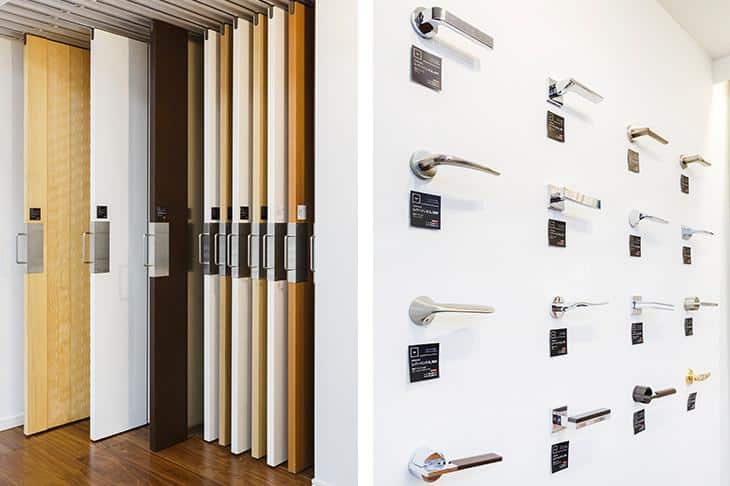- 建具もいろいろデザインがありますよ。普通の木目のタイプとか、ガラスのスリットが入ったものとか。
